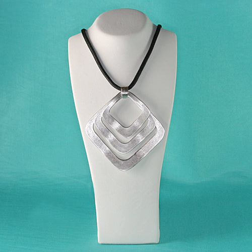 silberfarbener Anhänger. 3 unterschiedlich große quadratische Teile in einem Anhänger. der äußere ist ca. 6 cm x 6 cm mit schwarzem Textilband in 4 mm Durchmesser in 90 cm Länge einschließlich der Verlängerungskette aus ZAMAK - einer Metall-Legierung aus Zink. Aluminium. Magnesium und Kupfer. absolut nickelfrei. mit einer 7 Mikron feinen Silberauflage und einer transparenten Lackierung wegen Anlaufschutz und gegen schnellen Abrieb. Eine preiswerte Alternative zum herkömmlichen Silberschmuck, hergestellt in Europa.
