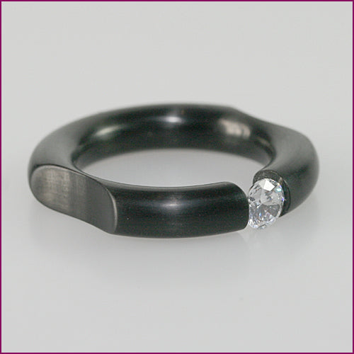 massiver runder Edelstahlring mattiert und geschwärzt mit eingefaßtem runden Zirk. und seitlichen Einbuchtungen. daher sehr angenehm zu tragen. ca. 4 mm Durchmesser