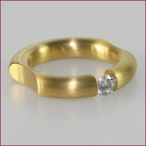 massiver runder Edelstahlring mattiert vergoldet mit eingefaßtem runden Zirk. und seitlichen Einbuchtungen. daher sehr angenehm zu tragen. ca. 4 mm Durchmesser