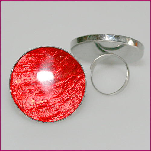 Der polierte Stahlring verbindet eine klare, moderne Form mit dem intensiven Schimmer einer rot gefärbten Perlmutteinlage. Die transparente Lackierung verstärkt den lebendigen Farbeffekt, der je nach Lichteinfall zwischen warmem Rot und tiefen, fast glühenden Reflexen changiert. Mit seinem Durchmesser von etwa 3,5 cm besitzt der Ring eine markante Präsenz, bleibt durch die verstellbare Ringschiene jedoch angenehm tragbar. Die Aufnahme mit dem zweiten Ring zeigt die offene Rückseite, die die flexible Größenanpassung und die saubere Verarbeitung sichtbar macht.