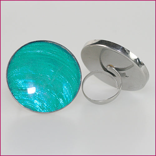 Der Ring wirkt als kraftvolles Statement‑Stück: polierter Stahl, eine verstellbare Ringschiene und eine große, petrolfarbene Perlmutteinlage, die durch die transparente Lackierung intensiv schimmert. Der Durchmesser von etwa 3,5 cm verleiht ihm eine markante Präsenz, während die offene Rückseite – auf dem zweiten Ringfoto gut sichtbar – die flexible Größenanpassung zeigt. So entsteht ein moderner, ausdrucksstarker Ring, der klare Linien mit lebendigem Farbeffekt verbindet.