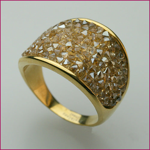 Edelstahlring poliert vergoldet mit goldfarbenen Swarovski-Steinen aus der Serie "Levien" in einer Schmuck-Schachtel. an der breitesten Stelle ca. 16 mm
