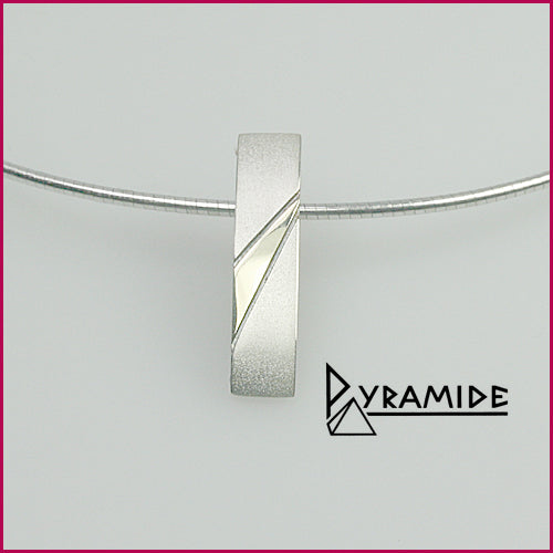 Silber-Anhänger feinmattiert. die Goldapplikationen in 585/ooo Gold ist poliert. ca. 26 mm lang und 6 mm breit. leicht konisch. aufgenommen mit dem Silber-Halsreif K 242. handgefertigte Goldschmiedearbeit