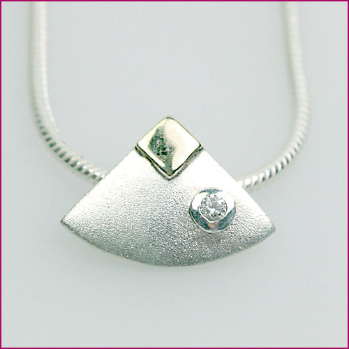 Silber-Anhänger mattiert. verschobenes Quadrat mit einem Quadrat als Applikation in 14 ct. Gold. ca. 20 x 20 mm. handgefertigte Goldschmiedearbeit. aufgenommen mit der Schlangenkette K 344