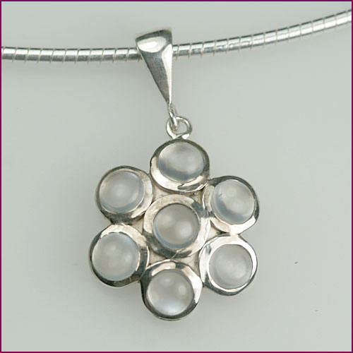 Silber-Anhänger poliert mit sieben runden Mondsteinen. ca. 25 mm lang. handgefertigte Goldschmiedearbeit. aufgenommen mit dem Halsreif K 242