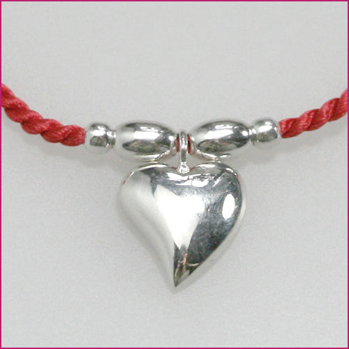 Type: Armband variabel durch den verstellbaren Verschluß aus Natur-Perlseide in verschiedenen Farben und 925/ooo Silber-Elementen hier mit Herz-Anhänger poliert ca. 10 mm Durchmesser aus der Serie "Mädel-Bändel", auf dem Bild in rot aufgenommen