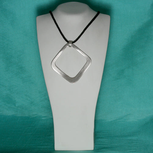 silberfarbener Anhänger. mit einem großen quadratischen Teil ca. 6 cm x 6 cm mit schwarzem Textilband in 4 mm Durchmesser in 90 cm Länge einschließlich der Verlängerungskette aus ZAMAK - einer Metall-Legierung aus Zink. Aluminium. Magnesium und Kupfer. absolut nickelfrei. mit einer 7 Mikron feinen Silberauflage und einer transparenten Lackierung wegen Anlaufschutz und gegen schnellen Abrieb. Eine preiswerte Alternative zum herkömmlichen Silberschmuck, hergestellt in Europa.
