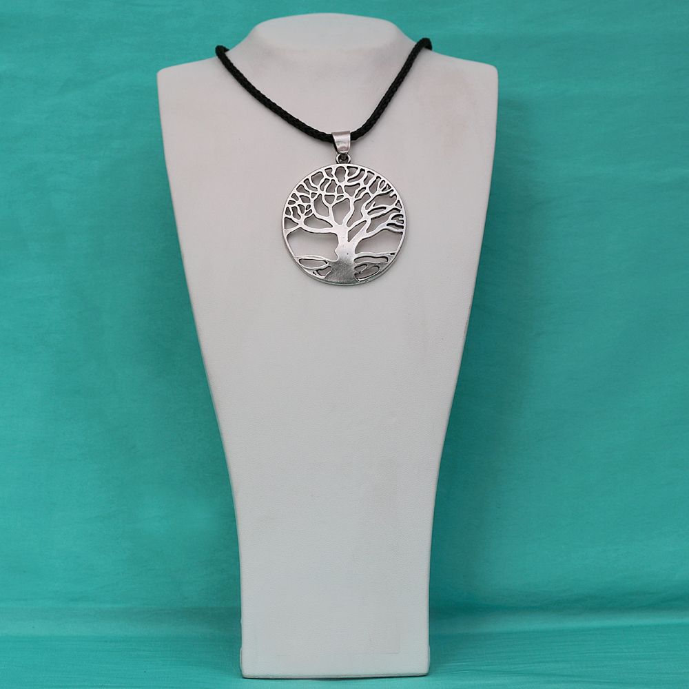 silberfarbener Anhänger. Motiv "Lebensbaum". mattiert. ca. 7 cm lang x 5.5 cm breit mit schwarzem Textilband in 4 mm in 90 cm einschließlich der Verlängerungskette aus ZAMAK - einer Metall-Legierung aus Zink. Aluminium. Magnesium und Kupfer. absolut nickelfrei. mit einer 7 Mikron feinen Silberauflage und einer transparenten Lackierung wegen Anlaufschutz und gegen schnellen Abrieb. Eine preiswerte Alternative zum herkömmlichen Silberschmuck, hergestellt in Europa.